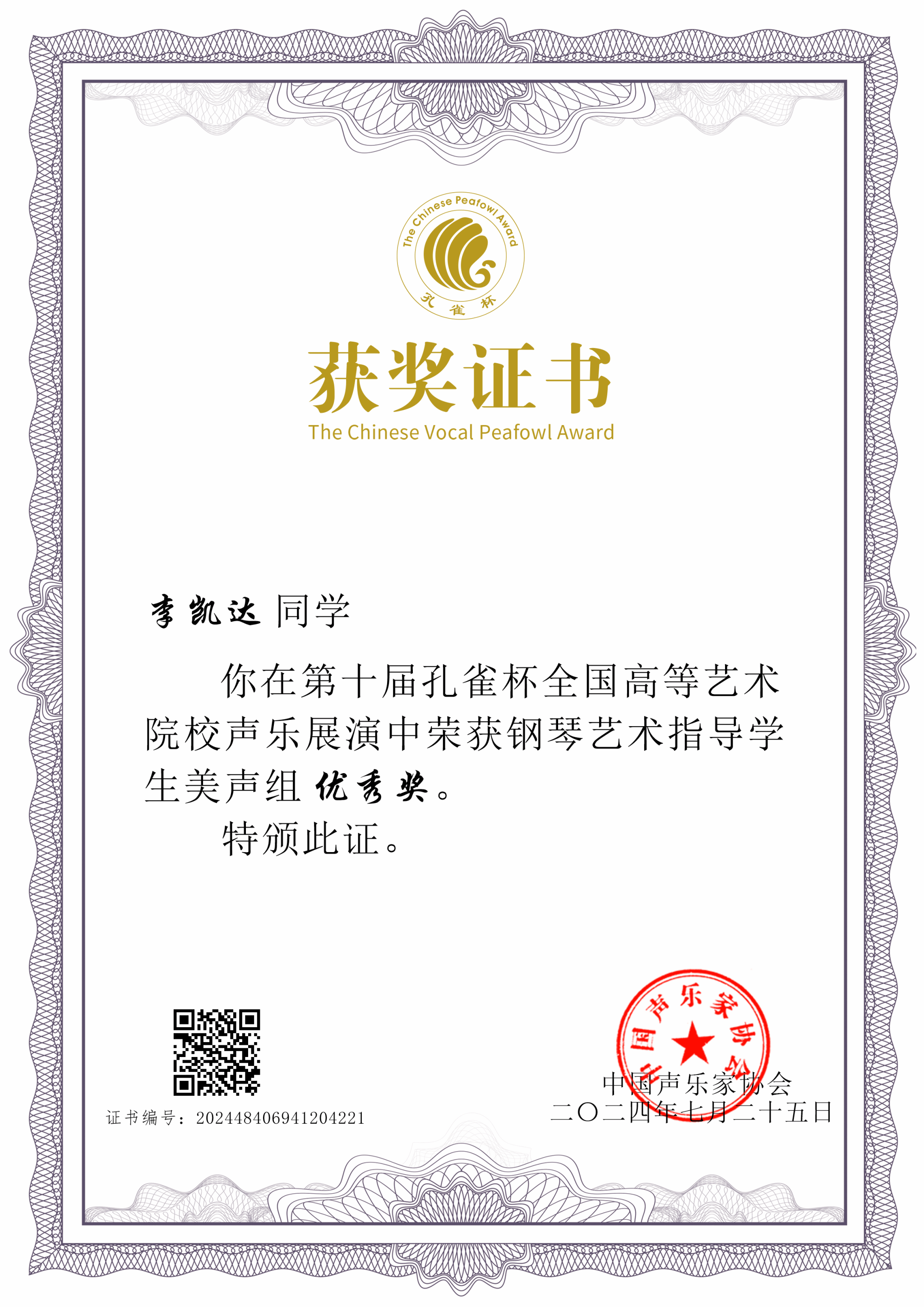 7月25日,由中国声乐家协会主办、华南师范大学承办的第十届孔雀杯高等艺术院校声乐展演圆满落幕。在这场音乐盛宴中,经过激烈的角逐,威廉希尔williamhill叶蕾教师指导的2023级员工李凯达,在2022级声乐员工蒋依宁的协助下,脱颖而出,荣获钢琴艺术指导员工美声组优秀奖。