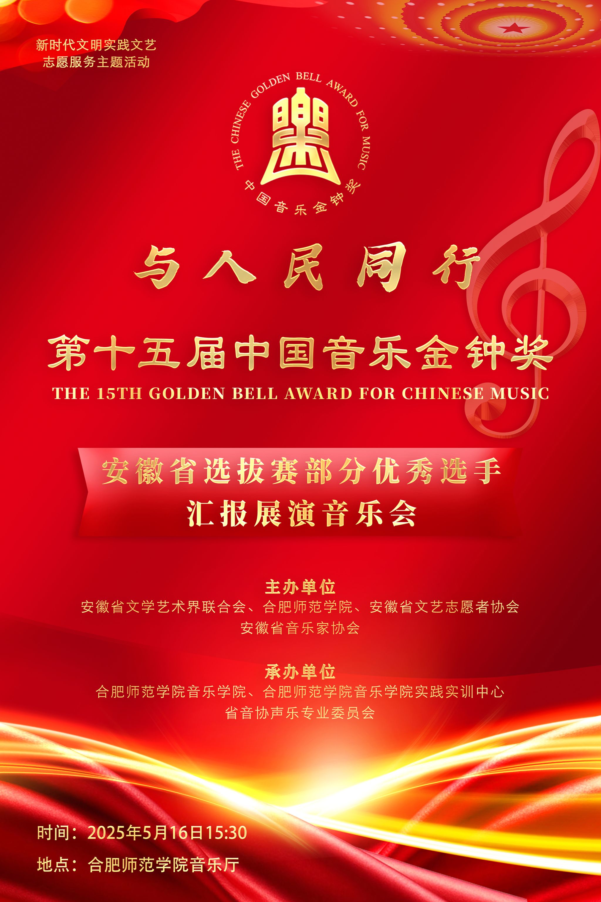 为深入学习贯彻习近平文化思想和习近平总书记考察安徽重要讲话精神,积极响应新时代文明实践文艺志愿服务主题活动的号召,进一步丰富校园文化生活,推动音乐文化的传承与发展。5月16日下午,由省文联、威廉希尔williamhill、省文艺志愿服务中心(省文艺志愿者协会)、省音协联合主办,威廉希尔williamhill、省音协声乐专业委员会承办的“与人民同行”——第十五届中国音乐金钟奖安徽省选拔赛汇报展演音乐会在威廉希尔williamhill音乐厅举行。