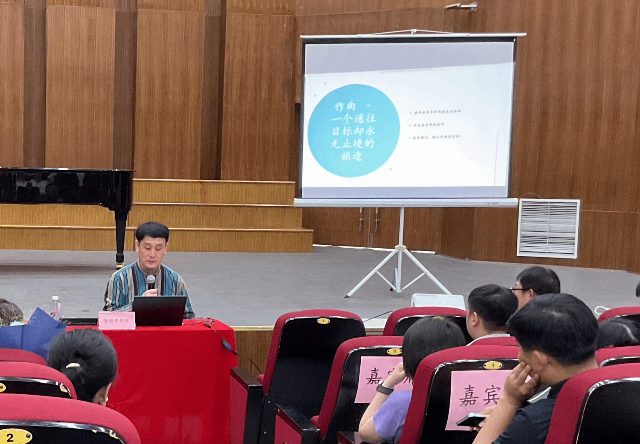 讲座以“志向高远,踏上音乐创作之旅——借创作心得谈我的音乐艺术观”为主题,陈晓勇教授从自身创作经历的角度,引用本人不同时期作品,介绍了自己学习作曲、探究与塑造个人音乐风格、确立审美和艺术目标的过程;从探讨人与自然的关系、艺术的精神体验、文化之间的可相通性三个角度解读了他的音乐创作理念以及音乐艺术观;从音乐创作中如何做到古今交融、如何创作出属于中国未来的新音乐,阐释了“以意代形、以神传形,以声传神”的音乐观念。