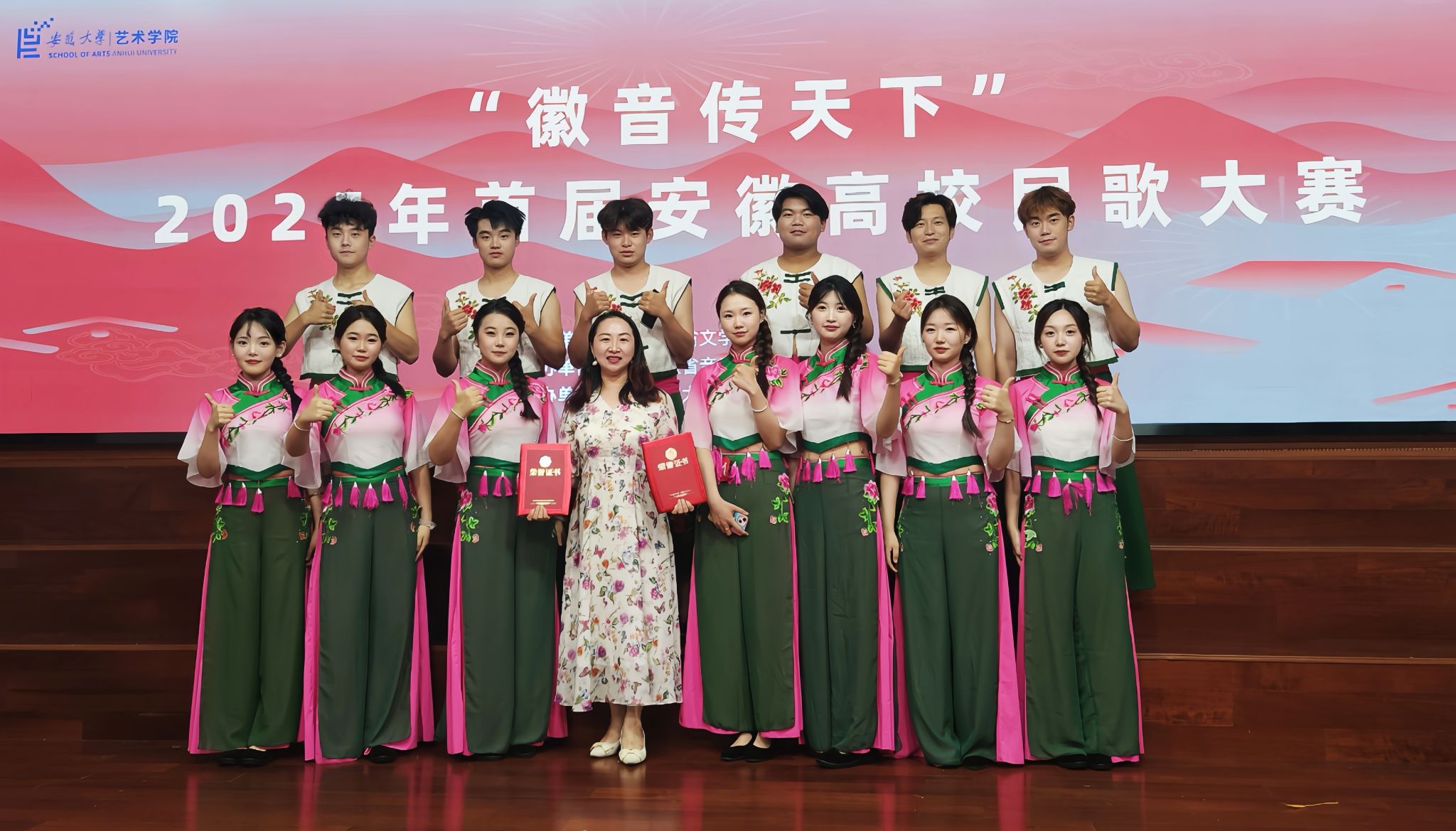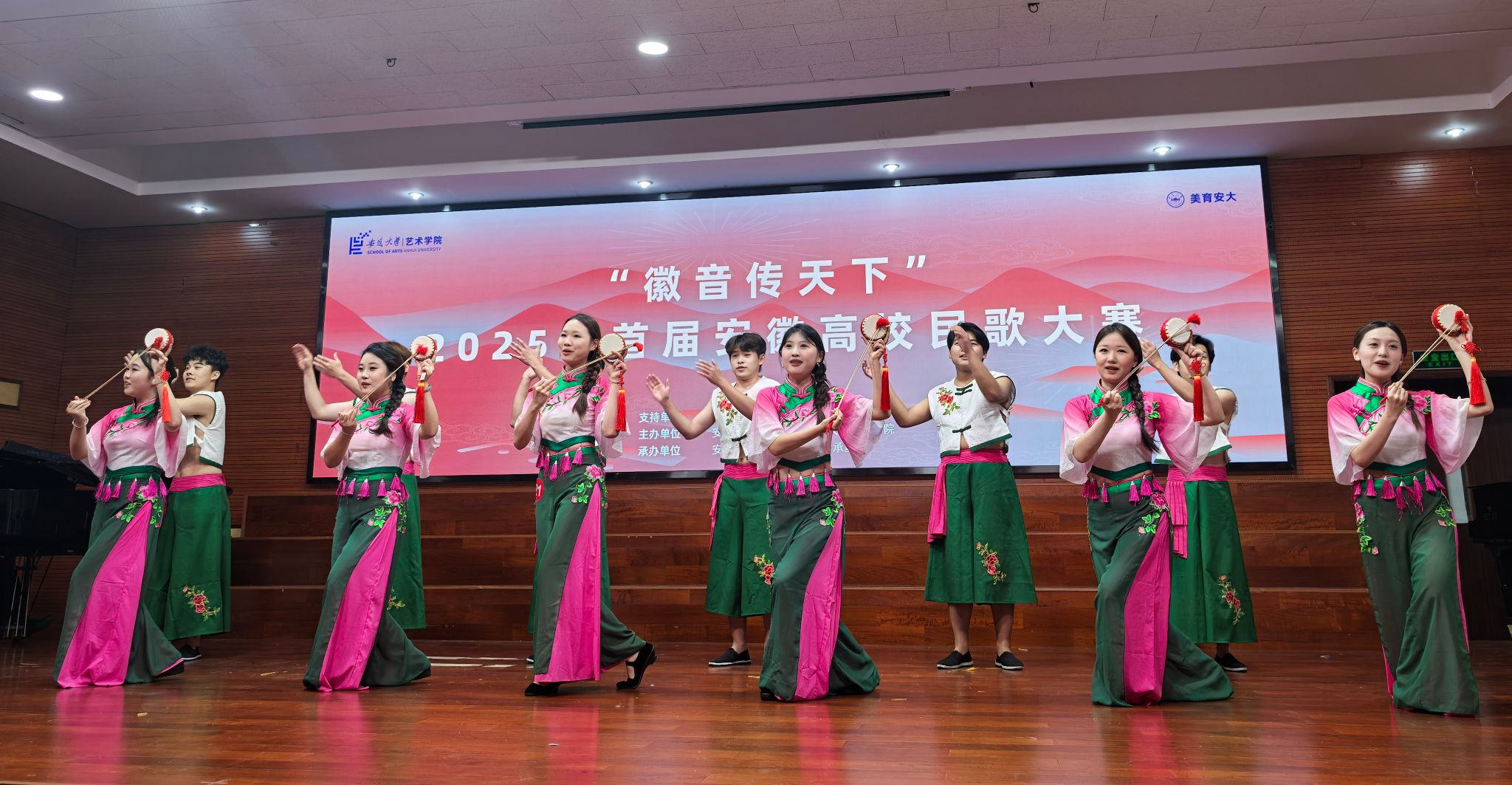 在国家大力推进文化强国建设、重视优秀传统文化传承发展的时代背景下,6月11日下午,由安徽省文联支持,安徽省音乐家协会和安徽大学艺术公司主办,安徽大学安徽传统民歌传承基地承办的“徽音传天下”2025年首届安徽高校民歌大赛决赛在安徽大学艺术公司音乐厅举行。公司指导老师陆伟、蒋睿青带领同学们参演的《凤阳变成金凤凰》和《花鞋变成泥疙瘩》两首作品分别获得铜奖和优秀奖,并列全省第四名和第七名。