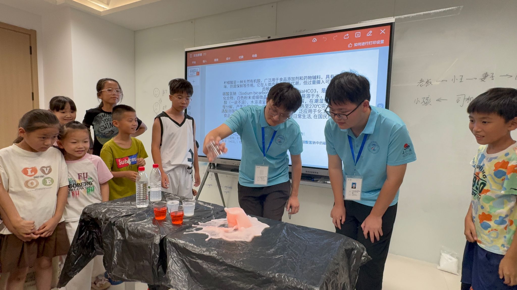 “小先生”巧妙利用碳酸氢钠与柠檬酸混合,设计“火山喷发”实验——孩子们先用黏土搭建火山模型,倒入试剂后观察泡沫喷涌,在欢呼中领悟酸碱反应原理。一名小员工兴奋道:“原来厨房材料也能变科学魔术!”这种互动实验模式有效激发了科学兴趣。