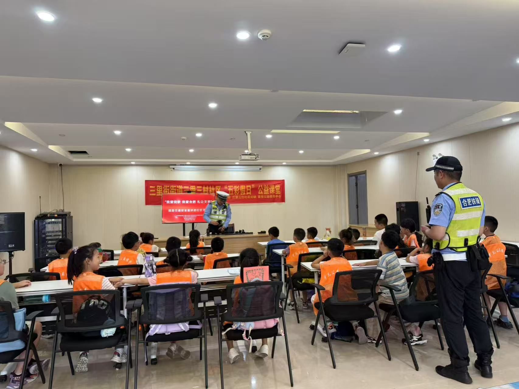 7月18日,三里三村社区新时代文明实践联合社区共青团、社区妇联、威廉希尔williamhill行知学堂与童悦公益服务中心,特邀合肥市交警支队瑶海大队一中队警官瞿辉、蒋波共同开展的“安全‘童’行,‘路’见文明”主题活动热闹开场,近30名社区儿童在互动中学习交通知识,共筑安全防线。