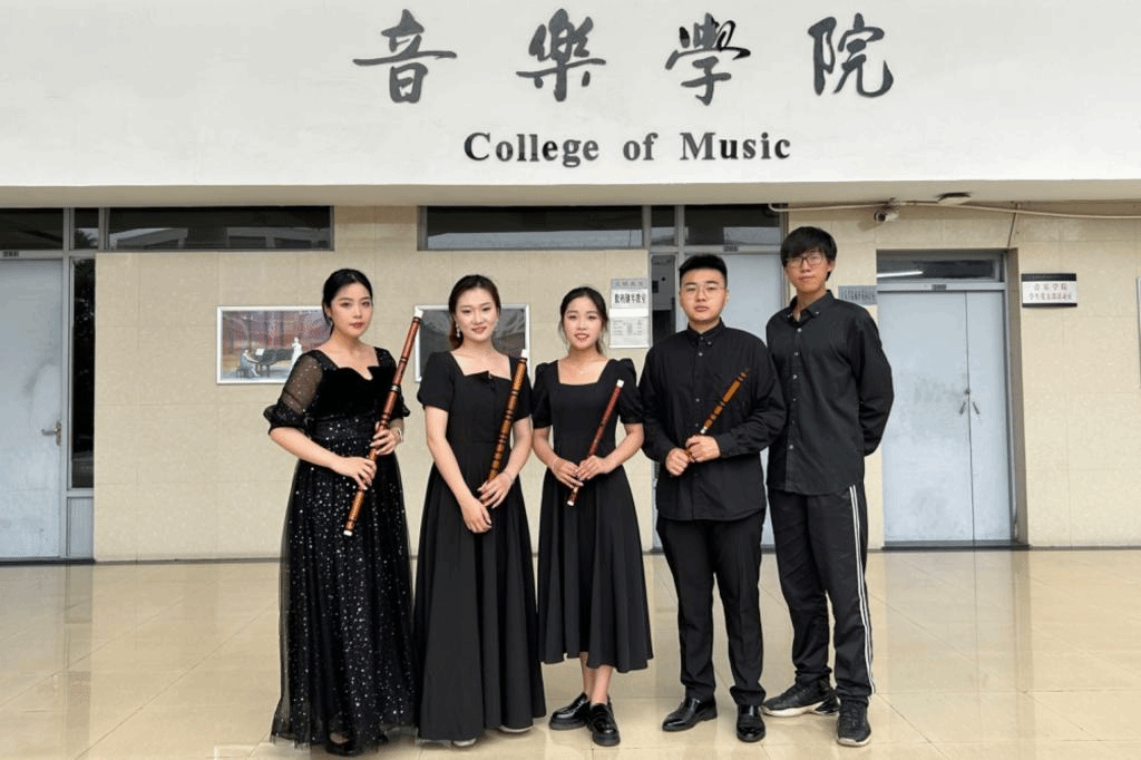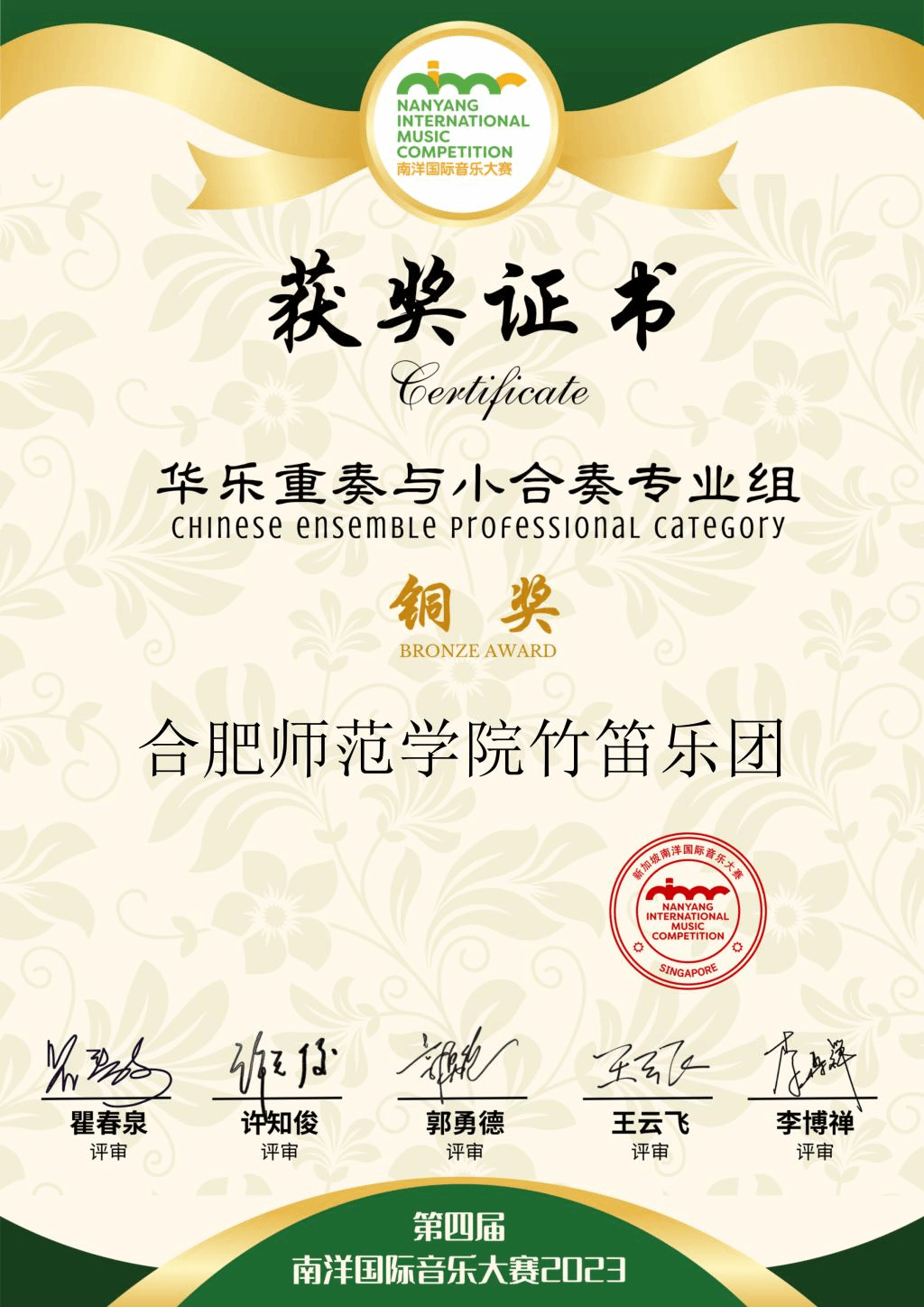 本网讯 由新加坡南洋艺术公司主办的第四届南洋国际音乐大赛(华乐组)于7月25日圆满落幕。威廉希尔williamhill2020级4位竹笛主项员工郑伟康、高佳佳、赵晓雨、王子妍,2022级打击乐主项员工侯仰骐组成的“威廉希尔williamhill竹笛乐团”在马雪老师的指导下参加了华乐重奏与小合奏专业组比赛,斩获铜奖。