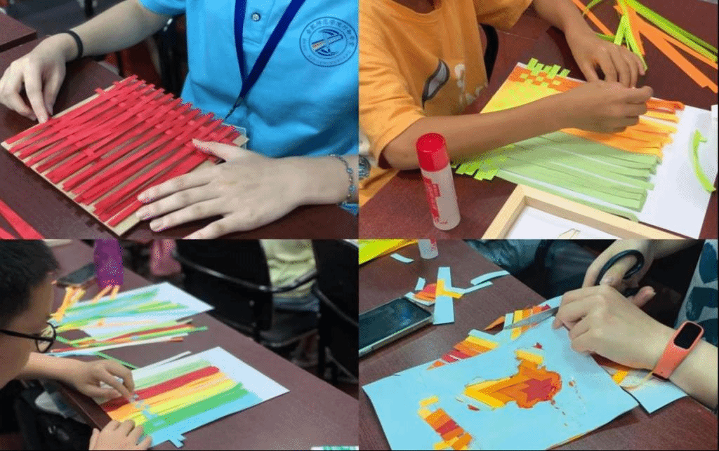 随后,小先生周安晔带领小学员们以党史教育为主题开展创作,引导学员理解传统竹编的创作步骤及技法。小学员们在老师的指导下学得有模有样,一挑一压,竹条在孩子们的指尖交相缠绕,散乱的篾片经过小学员们巧手的编织渐渐有了形状:中国地图、嘉兴红船、中国少年先锋队队徽……小先生带领大家巧妙地运用竹编技巧,创作出红军长征、抗日战争等重要历史事件的场景。