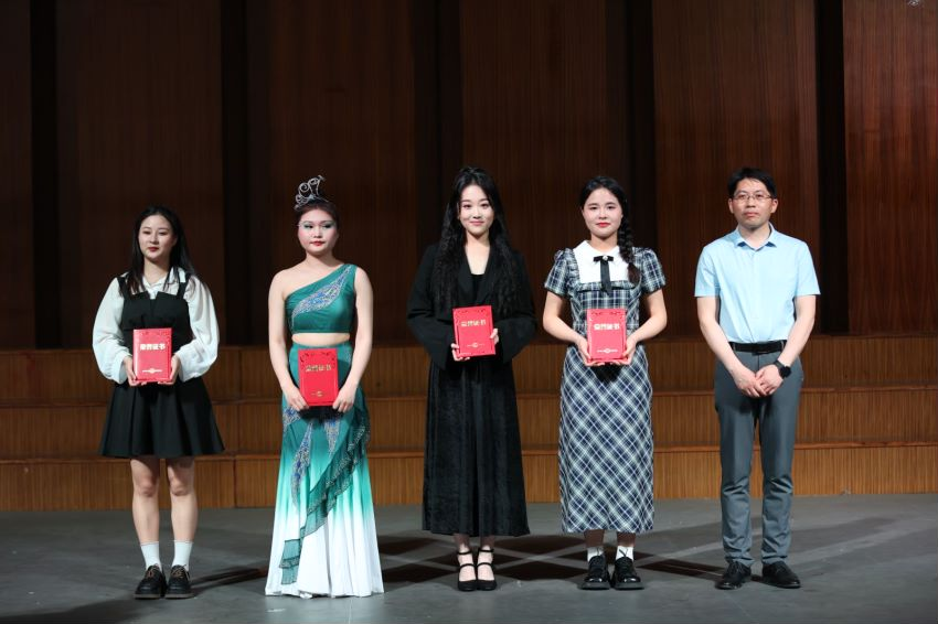 在音乐会的中场环节,公司举行了2023届国家奖学金,省级、校级优秀毕业生颁奖仪式。公司党委书记蔡成梅、经理李劲松、党委副书记宋辉、副经理康勤上台为获奖者颁奖及合影留恋。