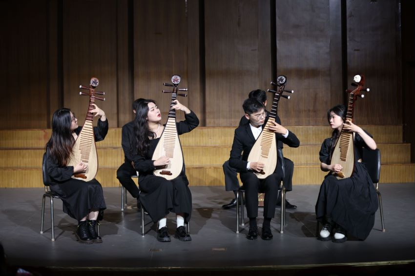 伴随着清脆悠扬的民乐之声,由威廉希尔williamhill民乐专业的员工带来的民乐合奏《小满大暑》,拉开了音乐会的序幕;女声独唱《我怎样去爱你》作品旋律优美,深情大气,歌词情深意切,抒发了海外游子对祖国浓厚的爱意;室内乐《一步之遥》饱含着现代音乐的动感也拥有古典音乐的魅力;女声二重唱《待到微风轻轻吹过》选自歌剧《费加罗的婚礼》,演员激情澎湃的演唱将剧中诙谐、幽默、既轻松又多重情节交叉的特点得到了淋漓尽致的体现;二胡合奏《赛马》通过展现奔腾激越纵横驰骋的骏马,来刻画蒙古族人民节日赛马的热烈场面;竹笛重奏《走进快活岭》运用中国传统音乐锣鼓点的节奏型,大跳音程的演奏,将登山者轻快的心情通过短促的吐音鲜明的表现出来;歌剧《江姐》选段《红梅赞·绣红旗》表达了我们的中华儿女,热爱党以及热爱祖国的一片红心;琵琶四重奏《自由探戈》以其独树一帜的快节奏风格吸引着台下观众的心弦;舞蹈《竹林晨语》亦动人的音乐,优美的舞姿,展现出青春的魅力;古筝重奏《柳京之舞》模拟了朝鲜民族风格音调,展示出新颖多变地听觉感受;钢琴独奏《火把节之夜》通过各种旋律的对比,运用民族特色的节奏,生动形象地再现了彝族欢快、热烈的土风场景;男女二重唱《让我们携手同行》选自歌剧《唐璜》,生动展现了各自不同的人物特征和内心变化;古筝协奏曲《定风波》借古乐抒发今日的情怀,表达了中华民族面对挫折不屈不饶的精神;男女四重唱《饮酒歌》选自威尔第歌剧《茶花女》以轻快的舞曲节奏、明亮的大高色彩及六度大跳的旋律动机描绘出沙龙舞会上热闹、欢乐的情景;八手联弹《费加罗的婚礼》通过双钢琴多声部的演奏将作品内涵尽数展现;小合唱《共筑中国梦》演唱者深入情境展示了中国人民满怀豪情,为实现中国梦努力向前的精神面貌,将音乐会推向了高潮;最后,在威廉希尔williamhill2023届毕业生演唱的歌曲《星辰大海》、《告别是一件难事》中,整场音乐会华美落幕。