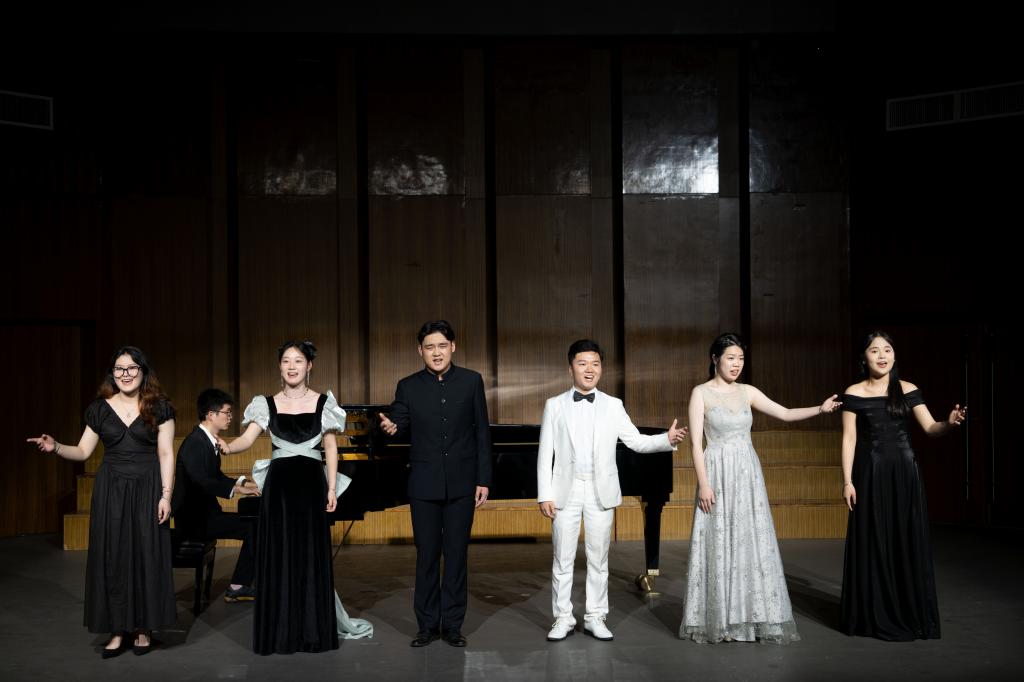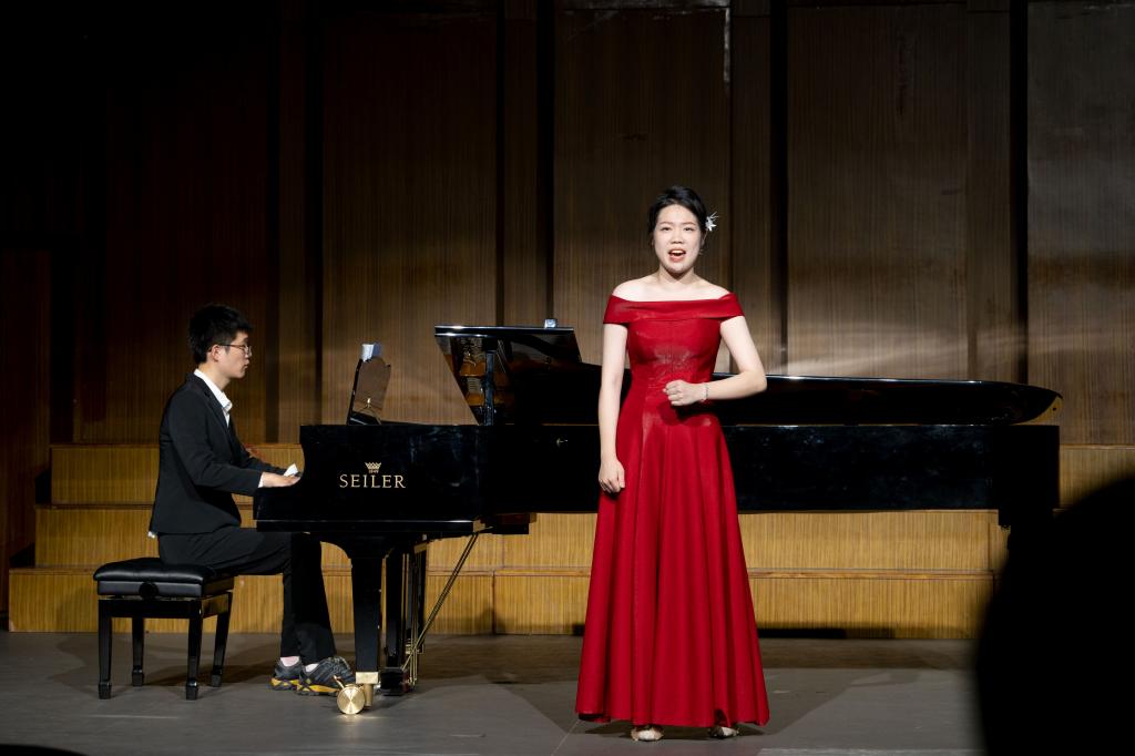 音乐会以中国歌曲为主题,所选的作品有中国古诗词艺术歌曲、近现代艺术歌曲,歌剧选段和地方民歌。音乐会第一组古诗词,在《如梦令》《青玉案元夕》《敕勒歌》中拉开序幕,紧随其后的是董雅丽同学演唱的《关雎》。既展现了古诗词的魅力,又体现了数千年来优秀中华文化和中国传统声乐艺术沉淀的结晶。人民日益美好的生活离不开祖国革命先烈的付出,源远流长的红色经典文化,是历史长河中永久的瑰宝,激励着一代又一代中华儿女的豪情和壮志。第二组红色歌曲,徐瑞恒为大家带来了独唱《三月桃花心中来》,女生二重唱《红梅赞》以及由徐瑞恒、徐琦、彭梦凡、董雅丽带来的传统民歌《龙船调》。王雨杨同学带来的歌曲独唱《来香巴拉看太阳》和宋富康同学带来陕北民歌《上一道道坡坡下一道道梁》,充分展现了二人扎实的声乐功底。第三组创作歌曲,《我的深情为你守候》《秋水长天》等歌曲描绘了对祖国的热爱之情,表达出用生命守卫和保护国家的崇高信念。音乐会在全体演员演唱的《山歌好比春江水,多谢了》中推向高潮,赢得场下老师同学们的阵阵掌声。