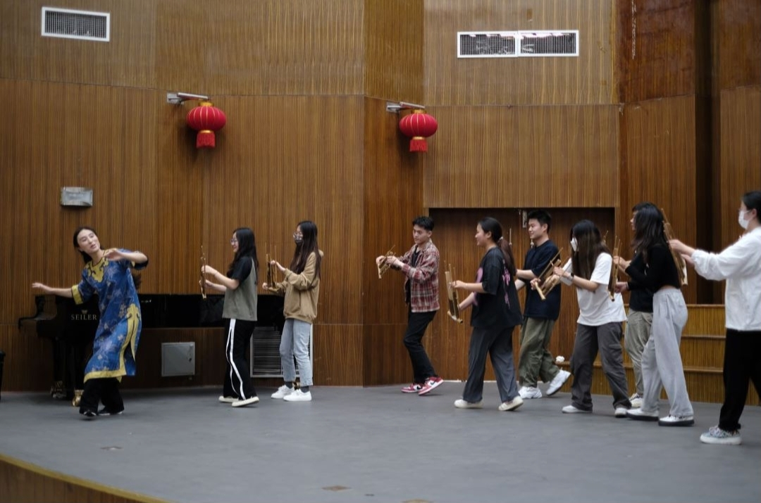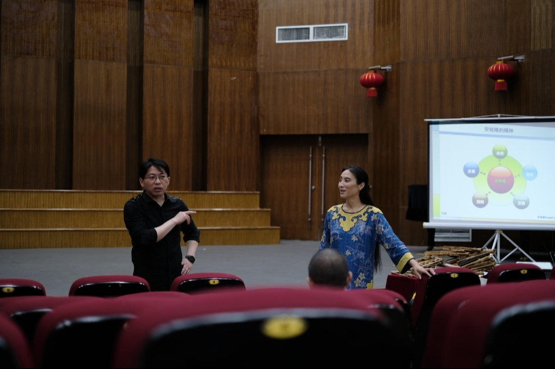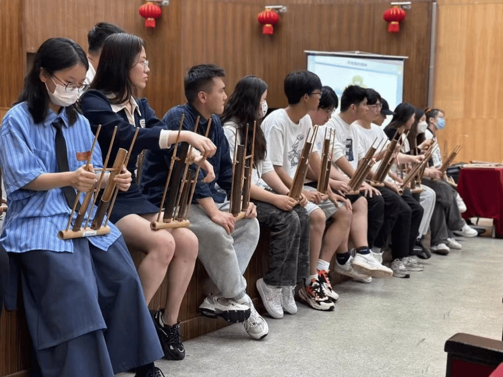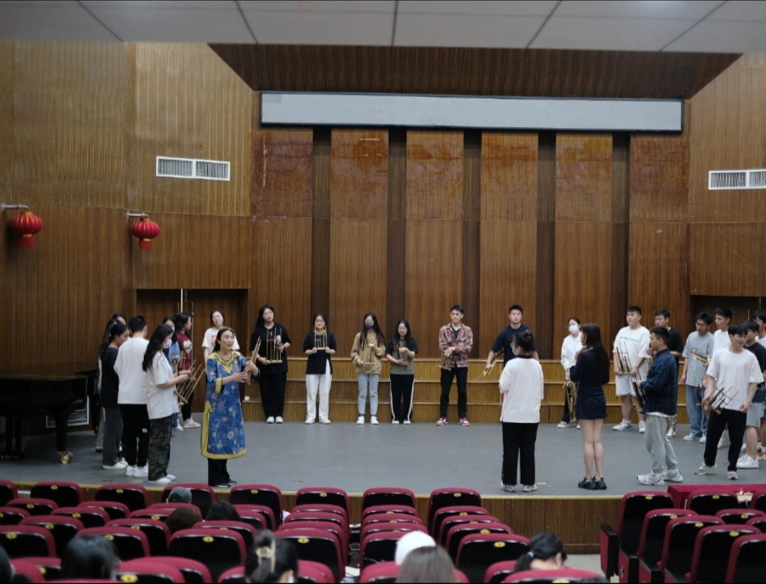 理论讲解后,何璐邀请师生上台共同演奏安格隆。演奏采用通关淘汰形式,何璐声情并茂地带领大家演奏安徽民歌《凤阳花鼓》等中外音乐曲目,现场气氛热烈,笑声此起彼伏。师生生动感受了安格隆“一人一音、链锁旋律、众人成乐”的独特魅力。