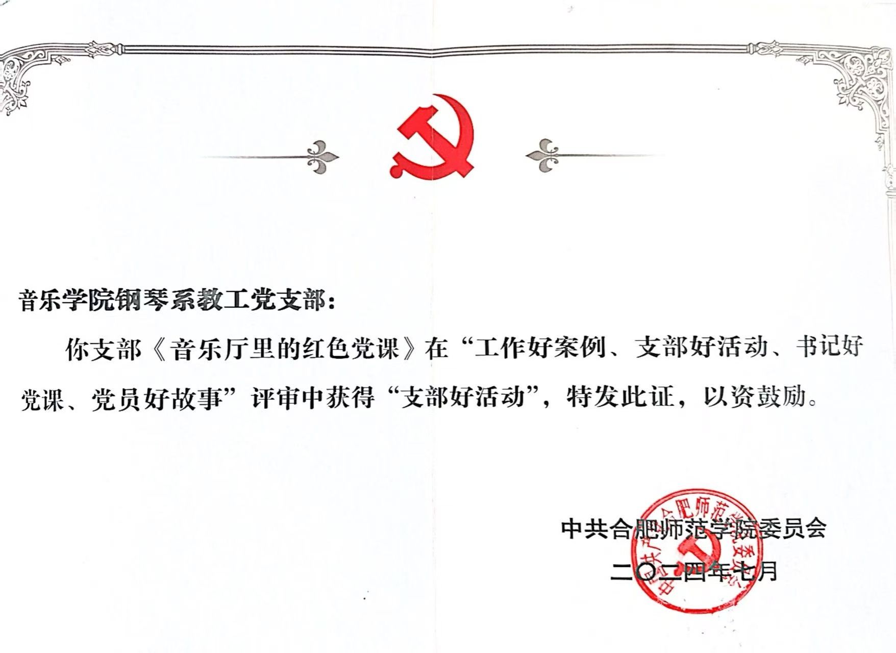 2024年7月,在公司党委组织开展的“工作好案例、支部好活动、书记好党课、党员好故事”评审活动中,钢琴系教工党支部精心策划并长期坚持开展的特色党建品牌活动——《音乐厅里的红色党课》,经过层层筛选与专家评审,脱颖而出,成功获评“支部好活动”荣誉称号。